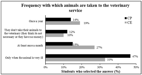 The students’ animals are only taken to a veterinarian when they are very ill (CP = 47%; CE = 33%), with both institutions showing significant percentages (Figure 7). However, several students reported taking their animals to a veterinarian at least once a month (CP = 15%; CE = 27%) or once a year (CP = 14%; CE = 19%). Some students also indicated that they never took their animals due to financial constraints or simply because they did not believe it was necessary to consult a veterinarian regularly (CP = 12%; CE = 10%). Moreover, there was no statistically significant difference between the schools (χ2 = 4.983; p = 0.173).