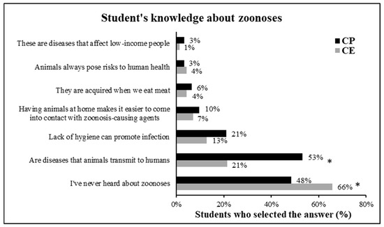 Students’ knowledge about zoonoses. (* = significant difference between the responses of students at the private school—CP—and public school—CE) (Chi-square; p < 0.05).