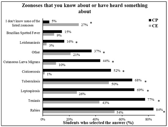 Zoonoses that the surveyed students have heard something about. (* = significant difference between the responses of students at the private school—CP—and public school—CE) (Chi-square; p < 0.05).