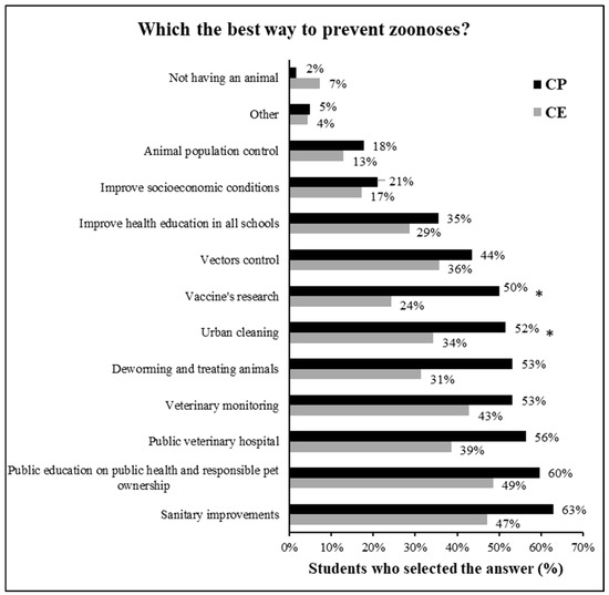 Responses of the surveyed students regarding the best way to prevent zoonoses. (* = significant difference between the responses of students at the private school—CP—and public school—CE) (Chi-square; p < 0.05).
