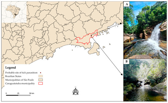 Geographic location of Caraguatatuba municipality (highlighted in red) on the north coast of São Paulo State, southeastern Brazil. The beige areas represent the municipalities of São Paulo State, while the outlined regions correspond to state boundaries. The red triangle indicates a probable site of tick parasitism. (A) Tronco Waterfall, the first site of tick parasitism; (B) Mancha Waterfall, where a second tick parasitism occurred and the probable site of infection of the case addressed in this study.