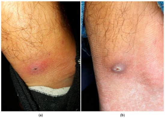 On 29 July (six days post-bite), the patient developed acute symptoms, including a cutaneous lesion with a surrounding macular eruption and a central necrotic ulcer at the bite site (Figure 2), as well as systemic symptoms such as inguinal lymphadenopathy, myalgia, and persistent headache. While the flu-like symptoms improved, the cutaneous lesion worsened, prompting him to seek medical attention on 31 July 2023, at a healthcare facility at Caraguatatuba. At this appointment, he was prescribed only anti-inflammatory medication.