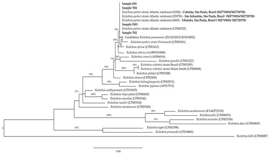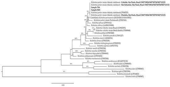 Consensus sequences were compared with those available in the GenBank database using the online Basic Local Alignment Search Tool (NCBI BLAST, https://blast.ncbi.nlm.nih.gov/Blast.cgi, accessed on 1 May 2025) to assess consensus similarity. Gene fragments were concatenated and subjected to phylogenetic analysis to determine their relationship with known Rickettsia species.