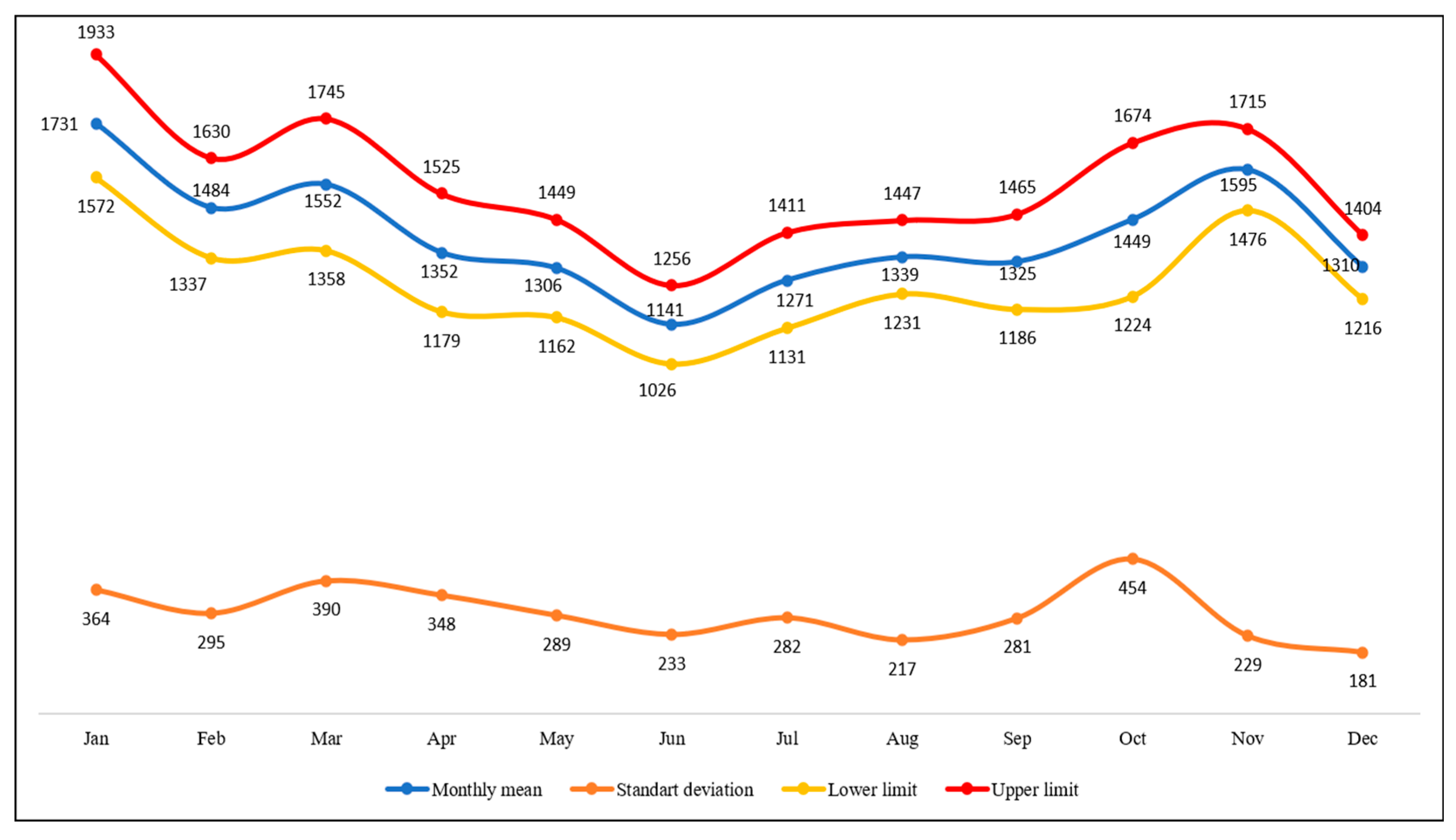 In addition, the 20 municipalities with the highest number of cases in the country were listed, with their respective numbers of cases, populations, territorial areas, demographic densities, and prevalence rates. We proceeded to create a control diagram by calculating the mean, upper, and lower limits, and standard deviation with a 95% confidence interval on the number of ACL cases distributed by months of the year in the period evaluated to compose the epidemiological analysis.