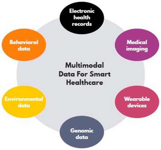 In healthcare, data comes from multiple modalities, such as electronic health records (EHRs), medical imaging, wearable devices, genomic data, sensors, environmental data, and behavioral data. Each of these sources offers a unique perspective on improving healthcare, as illustrated in Figure 1.