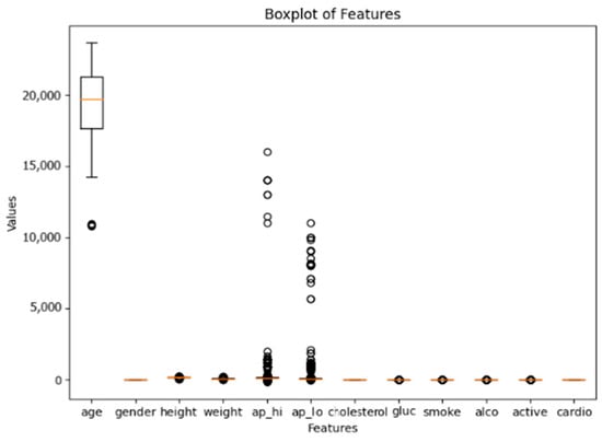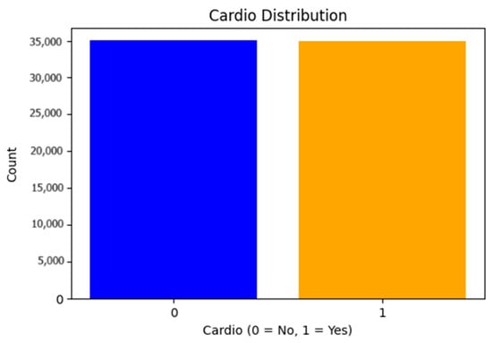 Figure 1. Boxplot of features to detect outliers on CVDd. - Class Imbalance Verification: After verifying the class distribution, we found that the dataset was balanced, meaning no additional techniques (e.g., SMOTE) were required to address class imbalance (Figure 2).