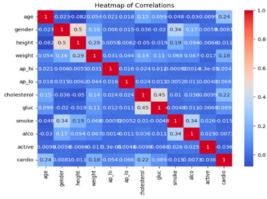 Cardiovascular dataset heatmap of correlations for feature selection.