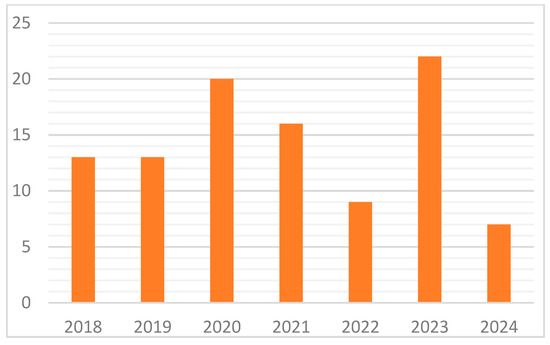 Figure 1 shows the distribution of articles according to their year of publication, testifying to a significant progression of research in this sector over the last three decades. In the years 2020, 2021, and, more specifically, in 2023, there is an increase in the number of publications, with 22 articles, which makes it the most important year in this journal. This progression illustrates the increasing importance of the detection of aggression and crime events in smart cities, as well as the rapid evolution of associated technologies. These results confirm the rise in smart cities and the essential role played by video surveillance supported by machine learning and deep learning methods to guarantee the safety and efficiency of urban services.