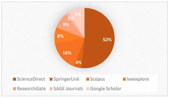 The articles selected for this study were sourced from several databases that enhance the credibility of the sources and the completeness of the literature review. Among the consulted databases, which encompass a variety of articles, are ScienceDirect, Scopus, SpringerLink, IEEE Xplore, ResearchGate, SAGE Journals, and Google Scholar. As shown in Figure 2, ScienceDirect stands out as the primary source with 54 articles extracted, accounting for more than half of the selected references. This predominance reflects the extensive coverage and high-quality articles available on ScienceDirect, making it a key database for studies related to technologies in smart cities.