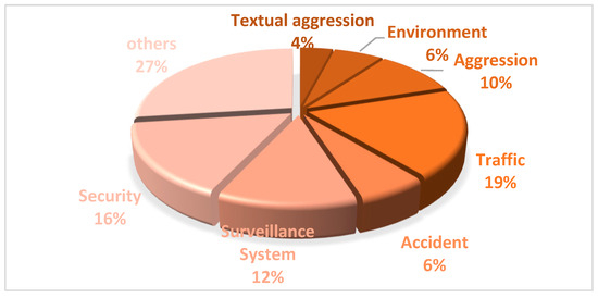 The results of the analysis of the literature articles highlight a multitude of fields of application for technologies for detecting and extracting abnormal events, in particular those related to violence and aggression. Figure 4 presents a variety of areas of interest, including the detection of textual aggression [37], the monitoring of anomalies in road traffic and the detection of accidents [23,38,39,40,41,42,43,44], as well as solutions to strengthen security in urban environments [3,7,9,42,45,46,47,48,49,50]. These different areas demonstrate the extent of the adoption of these technologies in various contexts, ranging from the moderation of online platforms to the proactive management of risks in physical environments. They also confirm their growing relevance for decision-makers and security managers, helping not only to quickly identify deviant behaviors but also to introduce preventive measures to improve urban safety and reduce the dangers linked to violent or risky behaviors.