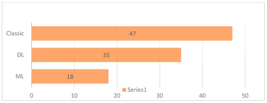 The analysis of the literature articles reveals several methods developed for the detection of abnormal events in video streams, divided into three main categories: classical methods, approaches based on machine learning, and those based on deep learning. As shown in Figure 5, the conventional methods focus essentially on the extraction of particular characteristics, such as optical character recognition (OCR) [51], motion paths [52], and frame segmentation [53]. These techniques are often based on predefined rules and manual feature extractions, offering a robust approach for simple cases but with limitations in more dynamic contexts.