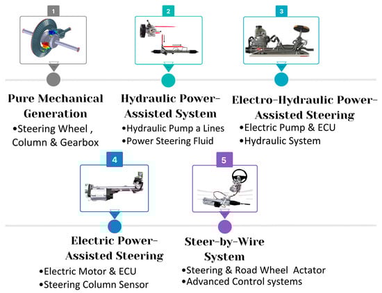 Figure 2 details the evolution from mechanical steering to steer-by-wire systems, with features like hydraulic pumps, electric motors, and control systems. Each step reduces the driver’s effort, improves accuracy, and moves toward all-electronic solutions, culminating in steer-by-wire systems for higher efficiency and greater design flexibility.