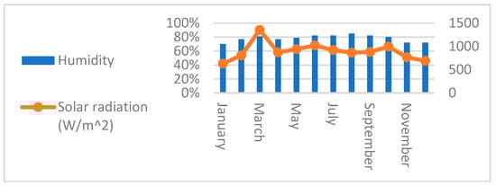 Graph of solar radiation and relative humidity in Larache, Morocco, 2024.