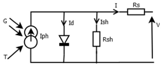 The single-diode model is the most commonly used model in the literature. It is used for PV cells and PV modules because of its simplicity and good accuracy. The single-diode electrical model of the PV cell is given in Figure 2. Its mathematical model is presented in the equation relating current and voltage [1].
