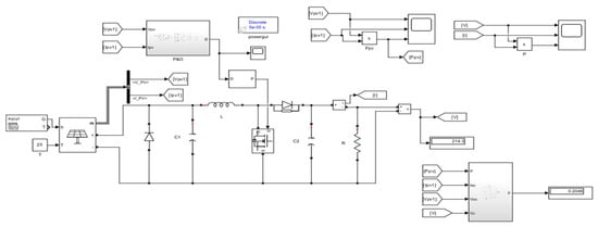 The performance of photovoltaic (PV) cells is significantly influenced by environmental conditions, necessitating maximum power point tracking (MPPT) control through a DC-DC boost converter [6,7]. This study employs the SunPower SPR-X20-250-BLK module (Pmax = 250 W) for simulation and fault analysis, selected for its established modeling parameters and industry prevalence. System characterization was performed under standard test conditions (25 °C, 1000 W/m2 irradiation), and the key electrical parameters are detailed in Table 1. The implemented MATLAB/Simulink model (Figure 3) facilitated comprehensive performance evaluation.