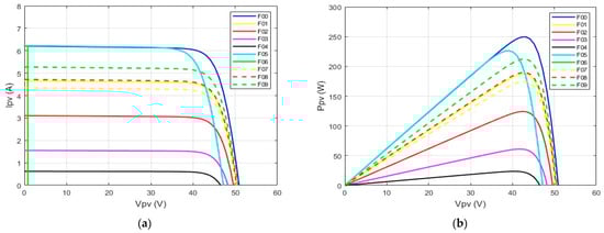 The fault diagnostic method relies on F00 reference values (no fault) and simulated fault values. All cases are discussed and detected. The examination of the main features of the I-V and P-V characteristics of the PV array is crucial for precisely identifying faults, whereby the open-circuit voltage (Voc), short-circuit current (Isc), and maximum power (Pmax) values areutilized to detect various fault types. The converter output voltage (Vc) was utilized to identify the region in which the defects manifested in the output voltage [15]. Then, the distortion rate Ii of all values is calculated as: