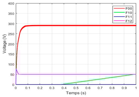 PV systems employ switching-mode DC-DC converters to power DC loads, utilizing pulse-width modulation to regulate current through duty cycle control [11]. The maximum power point tracking (MPPT) controllers [12] managing these converters may introduce system faults, including command signal errors (F10). Converter-related faults primarily manifest as short-circuit (F11) or open-circuit (F12) conditions, detectable through voltage and current waveform analysis. These faults significantly impact output voltage characteristics and system performance. Figure 5 illustrates the various boost converter fault modes and their corresponding effects on output voltage.