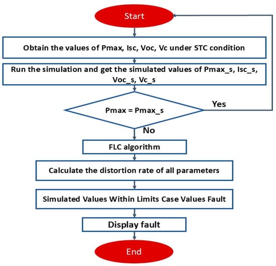 where is the reference value, and is the computed value. FLC uses the distortion rate result, which must fall between 0 and 1. The FLC algorithm compares the values of four parameters (Pmax, Voc, Isc, and Vc) with those of its reference. Table 3 shows the reference values of the parameters indicated for each defective scenario.