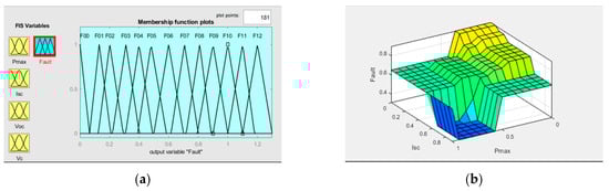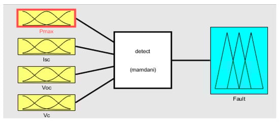 The mathematical computation of the studied PV system determines the membership functions. The IF–THEN, statement is the foundation of the fuzzy logic system [12]. Figure 9 illustrates the schematic of the proposed Fuzzy Logic Controller (FLC) for fault detection, while Figure 10a–d illustrates three triangular membership functions for each input variable and twelve inferred bases that effectively apply the fault condition product.