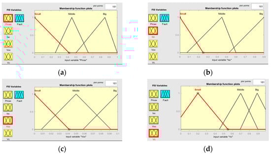 Fuzzy logic system inputs: (a) Pmax; (b) Isc; (c) Voc; and (d) Vc.