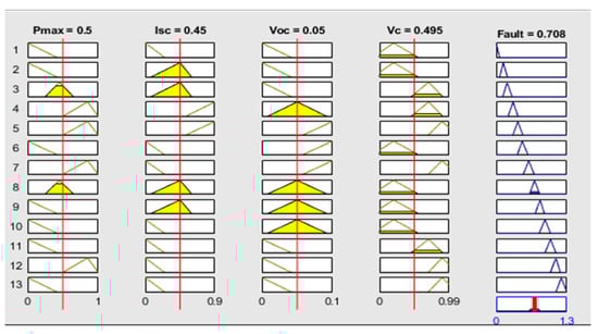 The results of the fuzzy logic-based fault detection system are presented in Figure 11 and Figure 12. As illustrated in Figure 11, the inputs for the fuzzy system include four critical variables: maximum power (Pmax), short-circuit current (Isc), open-circuit voltage (Voc), and operating voltage (Vc). In terms of the specific values, Pmax = 0.5 W, Isc = 0.45 A, Voc = 0.05 V, and Vc = 0.495 V; the triangular membership functions are significantly activated for specific fuzzy sets in each input variable. The yellow areas in Figure 11 indicate the activated functions, while the vertical red line shows the precise input value. The fuzzy inference process applies the rules defined in the rule base (12 rules in total, as shown in Figure 12) to produce an aggregated output corresponding to a fault level. The final result, after defuzzing using the centroid method, yields a value of 0.708, as shown in the last column of Figure 11. This value is interpreted according to the output membership functions.