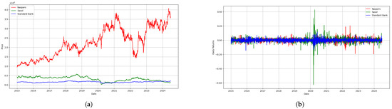 Daily stock price data for Naspers, Sasol, and Standard Bank were sourced from Yahoo Finance, covering the period from 1 January 2015 to 30 June 2024. Naspers, Sasol, and Standard Bank represent diverse sectors, namely media and technology, energy and chemicals, and financial services, respectively. Each of these companies has unique volatility drivers. Naspers has shown significant price swings due to its stake in Tencent and China’s regulatory shifts, experiencing rapid growth tempered by geopolitical impacts on tech stocks. Sasol’s performance is closely tied to global oil and commodity prices, and after a downturn during the 2020 pandemic, its stock has rebounded with rising energy prices and debt reduction efforts. Standard Bank, being one of South Africa’s largest banks, is influenced by macroeconomic conditions and has shown resilience through economic recoveries, benefiting from its exposure across Africa. Analyzing historical returns, volatility, and correlations among these stocks could further clarify their individual and comparative performance. The adjusted closing prices were used to compute daily returns, defined as follows: