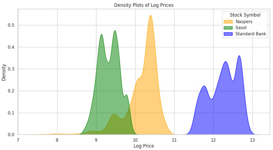 The density plot of log prices for Naspers, Sasol, and Standard Bank shown in Figure 2 reveals distinct distribution patterns for each stock. Naspers has the highest log-adjusted prices, while Standard Bank has the lowest adjusted log prices. The three stocks are multi-modal, indicating variability in price ranges that may reflect differing responses to market conditions, economic cycles, or sector-specific influences. This multimodality behavior are also shown in Table 3 suggesting that each stock has experienced price-level shifts over time, possibly due to volatility, external market events, or investor sentiment. Each of the models in Table 3 denoted as GMM, Lognormal mixture, Student’s t mixture provides two components per stock. GMM’s and Student’s t mixuture first component for Naspers has a higher mean of 0.002162 and volatility of 0.001319, but it occurs less frequently denoted by a weight of 0.34498. While the second component of GMM for Naspers has lower mean and volatility which dominates the return distribution. Similar behaviour is observed for Standard Bank returns. Overall, the GMM identifies distinct market regimes when there is calm and volatile movements, which gives a clear indication of losses and gains. The Lognormal mixtures captured asymmetric behavior it seem to be useful when returns are skewed, especially for Sasol returns. While, the Student’s t mixtures offer robustness to fat tails, better capturing extreme returns noted from Naspers and Standard Bank. This distribution highlights the complexity of stock price behavior and the potential influence of temporal factors on each company’s valuation.