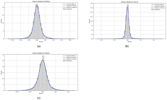 The results indicate that the Student’s t mixture model provided the best fit across the three analyzed stocks—Naspers, Sasol, and Standard Bank—based on AIC and BIC values. This suggests that the heavy-tailed nature of stock returns, particularly during divestment-induced market disruptions, is best modeled using Student’s t distributions [17,18]. This aligns with previous research highlighting the importance of accounting for extreme negative returns and tail dependencies in financial modeling [19].