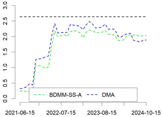 Firstly, various types of Bayesian dynamic mixture models (BDMMs) were estimated [14,15], both with state-space (SS) and normal regression (NR) components. Besides the original versions, weighted averaging schemes were also modified to include weighted averaged forecasting (A), forecasting from the component model with the highest posterior probability (H), and a median probability model (M) from Barbieri and Berger [36]. These were denoted as BDMM-SS, BDMM-SS-A, BDMM-SS-H, BDMM-SS-M, BDMM-NR, BDMM-NR-H, and BDMM-NR-M [37]. The details can be found in [14,15,37].
