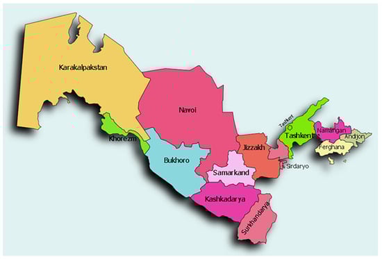 This study uses publicly available epidemiological data from Uzbekistan’s e-Government portal https://data.egov.uz/eng (accessed on 30 June 2025). The dataset includes annual infectious disease incidence rates across 13 regions from 2010 to 2019, structured as a time series to facilitate clustering techniques such as Hamming Distance for detecting temporal and regional disease patterns.These regions are shown in Figure 1.