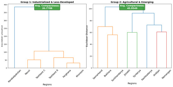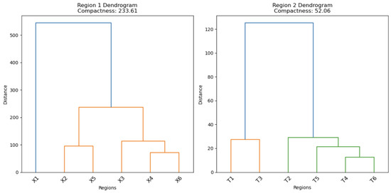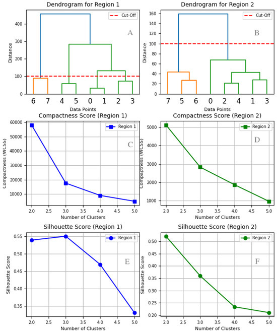 The hierarchical clustering dendrograms as well as compactness and silhouette scores for both regions are presented in Figure 2 (top row). A cutoff threshold (red dashed line) was selected to balance cluster separation and compactness.