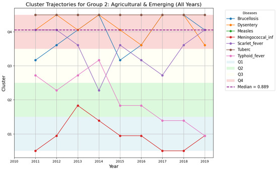 - Group 1: Higher variability in disease patterns, with diseases like Tuberculosis and Dysentery showing consistent year-over-year changes. This suggests that outbreaks in these regions may be strongly influenced by environmental or socio-economic factors, requiring targeted control measures.