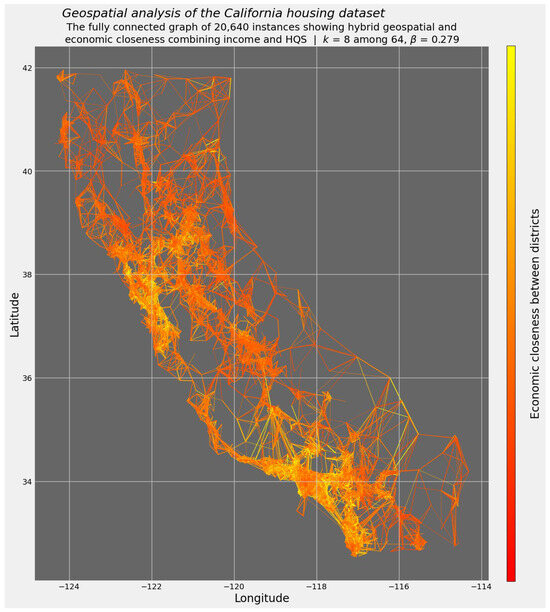 A depiction of 20,640 districts in California and their k = 8 nearest neighbors. The red-to-yellow color gradient reflects nearby populations and their affluence.