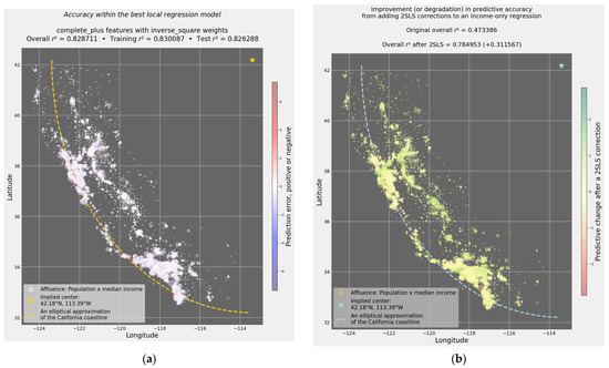 Iterative local regression and 2SLS correction of residuals in the California housing dataset. (a) Accuracy within the best local regression model; test r2 = 0.826288. (b) 2SLS correction of residuals results in a gain of 0.311567 relative to an unconditional one-variable regression estimating housing prices according to each district’s median income.