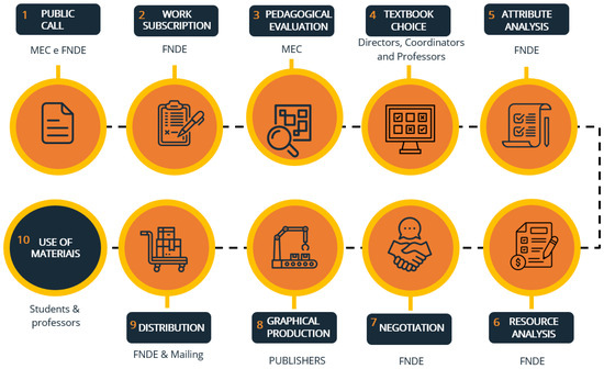 The PNLD workflow (Figure 1) involves several stages, beginning with publishers submitting materials for editorial and pedagogical evaluation to ensure alignment with the national curriculum of Brazil. Once approved, textbooks move into the logistics phase, where FNDE plans printing and distribution.