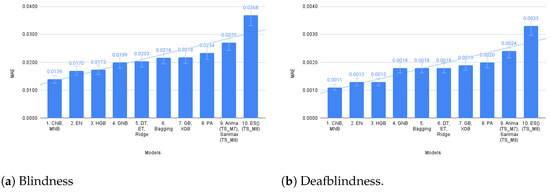 Table 6 presents the results of the MAE and RMSE metrics for the models with the best performance for the blindness and deafblindness scenarios. These results lead us to conclude that ML models, particularly those based on the naive Bayes algorithm, outperformed time series models such as ARIMA and SARIMAX.