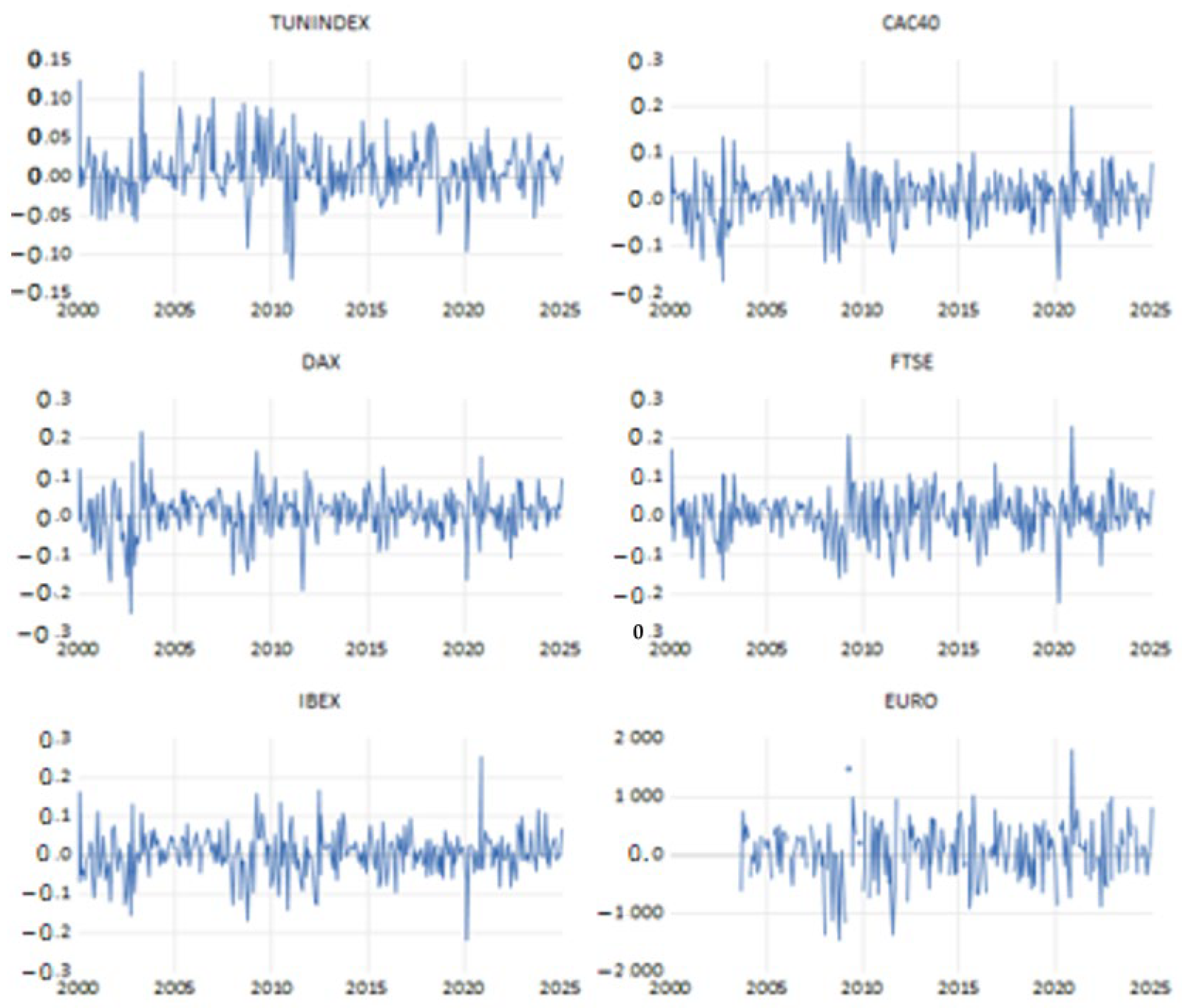 Figure 1 displays the returns of stock market indices (TUNINDEX, CAC40, DAX, FTSE, IBEX, and EURO), revealing a volatility clustering phenomenon. This pattern indicates that periods of high volatility tend to be followed by further significant fluctuations, while periods of low volatility also persist consecutively. Large price movements cluster together, as do smaller ones, reflecting the temporal persistence of market fluctuations. Markets react in this manner to external shocks and investor behavior. This phenomenon is crucial for forecasting future volatility and risk management, as it helps optimize portfolios by anticipating extreme movements.