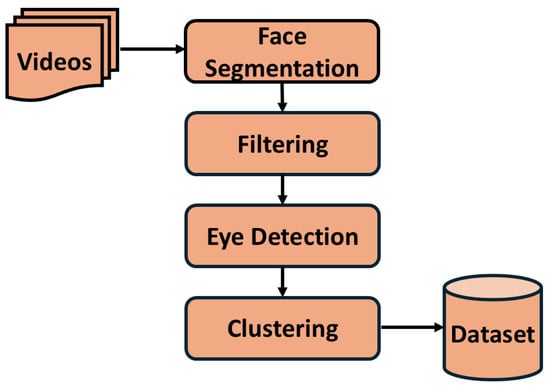The videos recorded on mothers (sows) and their daughters (gilts) go through a rigorous preprocessing, as shown in Figure 3. The process includes segmenting faces of animals in the images using the YOLOv9 segmenter [21]. The confidence threshold is kept high, i.e., 0.9, to extract only the best-quality face segmentations. This further goes through another filtering process based on the distance of the animal from the camera. For this, we employ the aspect ratio of the segmented face to the original image size. If the aspect ratio is more than 0.4, then the segmented face is sent to the next processing step. As mentioned before, eyes are one of the important features for stress. Thus, the segmented faces go through a YOLOv5-based eye detector [21]. The images with both eyes visible are kept for the final preprocessing step. Finally, clustering is performed on the set of images to pick distinct images with different orientations. A pre-trained VGG-16 [22], without the final classification layer, is used to extract the features, which are clustered using the k-means algorithm. In this, we use a maximum of 50 clusters, which means one image per cluster would be saved in the final dataset. This preprocessing is completed for 23 mothers and 97 daughters and yields a dataset of approximately 40,000 images.