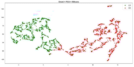Emoti + PCA + K-means clustering, where red points correspond to the SS class and green points to the LS class.