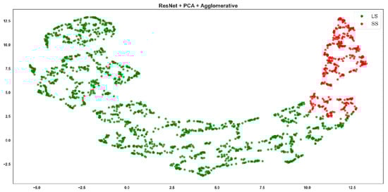 Resnet + PCA + Agglomerative clustering, where red points correspond to the SS class and green points to the LS class.
