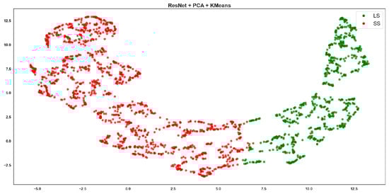 Resnet + PCA + K-means clustering, where red points correspond to the SS class and green points to the LS class.