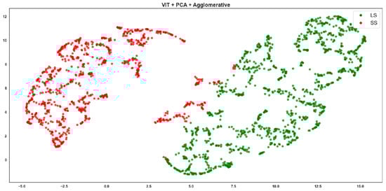ViT + PCA + Agglomerative clustering, where red points correspond to the SS class and green points to the LS class.