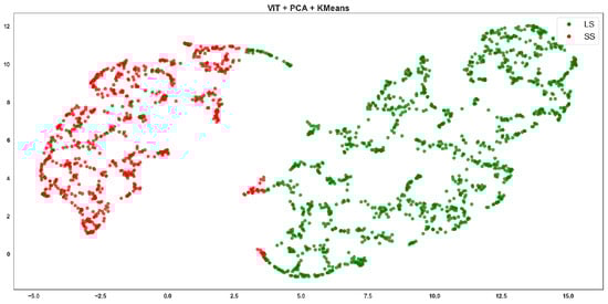 ViT + PCA + K-means clustering, where red points correspond to the SS class and green points to the LS class.