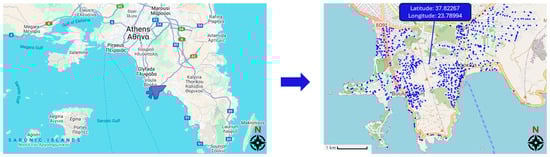 More specifically, the said smart bins contain sensors that measure the volume of the waste that they contain. The majority of bins measure the volume every hour, whilst five (5) of them do so every ten (10) minutes. The total number of bins that are currently installed in the municipality is one thousand (1000). A visualization of the bins on a map of the municipality is provided in Figure 1, with the bins highlighted in blue.