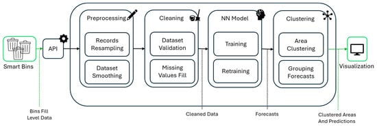 Prior to training the corresponding time series forecasting model, specific preprocessing and data cleaning steps had to take place in order to ensure the reliability of the dataset and minimize the data bias that could be introduced into the ML model. Firstly, since some smart bins measure the volume of the waste every ten (10) minutes whilst the majority of the bins measure it every hour, some bins contained six (6) observations per hour. As a result, the latter were sampled to only keep the observation in line with the maximum value per hour, since their number was negligible compared to the total number of bins, and thus, their down sampling did not affect the accuracy of the predictive model. The selection of the maximum value is considered to handle the event of a garbage truck emptying the bin and provide a better idea of the rate at which a bin fills. Moreover, a technique called Fourier smoothing was applied on the volume column to smooth the corresponding time series and remove any potential “noise” [], whilst capturing the underlying seasonal variations in the data.