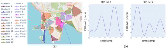 More specifically, the data are collected with the help of appropriate application programming interfaces (APIs). Then, specific preprocessing and data cleaning tasks take place to ensure the reliability of the data, thus dealing with any potential data bias, as described in Section 3.2. Afterwards, the NN is trained on these data to provide predictions with regard to the future fill levels of the bins. It is also worth noting that the model updates itself whenever new data are available so that it is able to recognize the latest trends in the dataset. When the predictions for every bin are provided by the model, the rate at which each bin will fill is calculated based on them. Given the fact that the predicted fill rate for every bin is available, the K-means algorithm is applied. The optimal number of clusters/regions in which K-means will split the municipality is determined by the elbow method. Furthermore, the number of clusters in which those regions will be grouped, based on the predicted fill levels and the corresponding fill rate, is also determined by the elbow method. However, the users can also use a number of clusters of their choice. Finally, an interactive map is generated, where the different areas and bins groups are highlighted, providing a list in descending order with regard to the corresponding fill rate of every group of bins. Since the fill rate of the bins is a strong indicator of the touristic flows, this visualization showcases which areas are more and less touristic, thus allowing policy makers to make better, data-driven decisions. An indicative example of such a visualization is depicted in Figure 3a, where the bins in areas “10” and “3” are projected to have the greatest number of tourists, followed by area “1”. Moreover, an indicative visualization of the time series for two (2) bins for a small period is shown in Figure 3b, where the forecasted values are marked in red and the actual values per bin are shown in blue.
