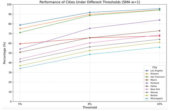 Through Figure 1, we can observe the trend of the accuracy of the 10 cities changing with the threshold when the optimal window size of SMA is 1. First, the accuracy of all cities increases with the increase in threshold, among which Los Angeles, San Francisco, and Phoenix have significantly higher accuracy than other cities, while Portland’s accuracy shows a significant improvement. However, the accuracy of Miami does not increase significantly with the increase in threshold, which may be related to its climate characteristics and the stability of temperature changes. Miami has a tropical climate with relatively stable temperature and small changes, so the model could capture the temperature trend more accurately during the prediction process. This means that as the threshold increases, the error tolerance range increases. Although larger deviations can be tolerated, the prediction accuracy of the model is already high due to the small temperature change itself, and the impact of further increasing the threshold on the results becomes limited. In other words, the prediction accuracy of Miami may be close to the limit of SMA. Within a more tolerant error range, the model is very stable, so even if the threshold is increased, the accuracy will not change significantly. This situation is more common in cities with relatively stable climates, because the temperature itself fluctuates less and the model’s prediction error is also lower.