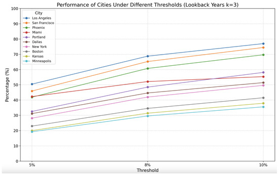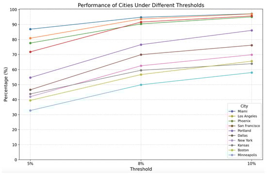 For the 5% threshold, Phoenix, SF, and LA show high accuracy, with prediction accuracy of more than 70% in these cities, especially LA, which has an accuracy of 78.79%. However, the performance for Minneapolis, Boston, New York, and Kansas is not very good, with accuracy rates less than 50%. When the threshold is increased to 8% or even 10%, the accuracy of all cities increases. At the 8% threshold, except for Minneapolis, which has an accuracy of 48.51%, all other cities have an accuracy of more than 50%. Similarly, at the 10% threshold, except for Minneapolis, which has an accuracy of 56.00%, all other cities have an accuracy of more than 60%, especially Phoenix, SF, and LA, whose accuracy is as high as about 95%.