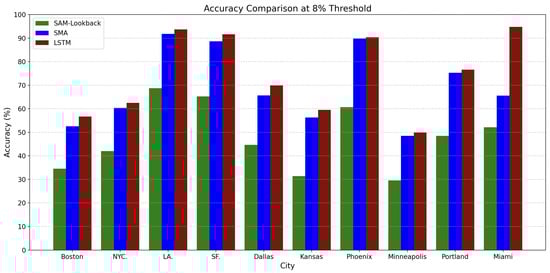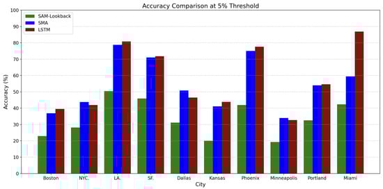 As can be seen from Figure 5, Figure 6 and Figure 7, the LSTM model had the best overall performance under the three thresholds in Percentage Error, especially in Miami, where the prediction accuracy of LSTM was far ahead of that of the SMA and SAM-Lookback models. This performance was mainly due to the fact that LSTM could effectively capture long-term dependencies and complex nonlinear patterns in the data. However, the prediction accuracy of the SMA model was similar to that of LSTM in most cities. Except for in Miami, SMA’s performance was only slightly inferior, still showing excellent results. This shows that although SMA cannot handle long-term dependencies, it is accurate enough for these simple temperature data with little fluctuation. In contrast, the performance of the SAM-Lookback model under different thresholds was always the worst, failing to reach the level of LSTM and SMA.