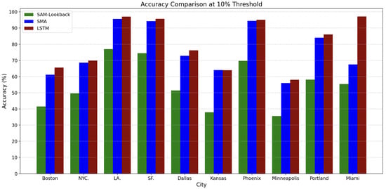 Similarly, in the Percentage Error measurement method, the performance of each city under the SAM-Lookback model is roughly the same as that of the SMA model. Los Angeles, San Francisco, and Phoenix all performed well under the three thresholds, especially when the threshold was 10%, the accuracy of the three cities reached about 70%, or even higher. However, the performance of Minnesota, Kansas, and Boston was still weak, and the accuracy did not exceed 50% when the threshold was 10%.